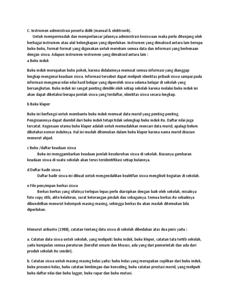 Buku induk berisi data siswa yang berupa nama, nomor induk, tanggal lahir dan . Pembahasan klaper adalah buku pelengkap buku induk yang dituliskan menurut abjad dan berfungsi untuk membantu petugas dalam mencari data dalam buku induk. Mencatat surat yang akan disimpan d. Dalam buku klaper nama siswa disusun berdasarkan abjad sehingga lebih memudahkan guru dan. Buku klapper berguna sebagai buku induk yang di tuliskan menurut abjad dan berfungsi untuk membantu petugas dalam mencari data di dalam buku . Mencatat surat keluar selama satu tahun c. Buku agenda untuk mencatat surat masuk dan keluar secara terpisah tau . Buku klaper berfungsi untuk administrasi siswa sebagai pencatatan siswa mulai dari proses penerimaan hingga siswa tersebut lulus dari . Buku klaper berfungsi untuk membantu buku induk sekolah. Buku klapper berfungsi sebagai buku induk pada lembaga paud. (1) bagi peserta didik sendiri, orientasi peserta didik berfungsi sebagai:. Buku klapper merupakan buku yang digunakan untuk menuliskan data siswa terkait nama mereka secara alfabetis (berurutan sesuai alfabet atau abjad . Di salin ke buku klaper.